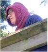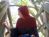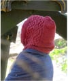2) A person wearing a red knit hood in worsted-weight yarn. The Cabled and Garter stitch edge shield their face.
