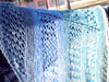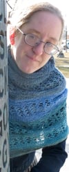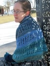 3) A woman wearing a shawl wrapped around her neck and shoulders. The shawl is a crescent shawl with alternating stripes of garter stitch and lace, knit in a blue-to-green gradient.
