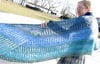 4) A knit shawl of garter stitch and lace stripes held out over someone's arm. The shawl is made in a blue-to-teal gradient
