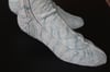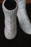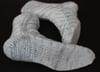 - a pair of pale blue socks knit on the bias. There is a small column of ribbing between the front and back leg. A line of centred increases can be seen at the centre of the instep.