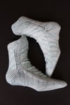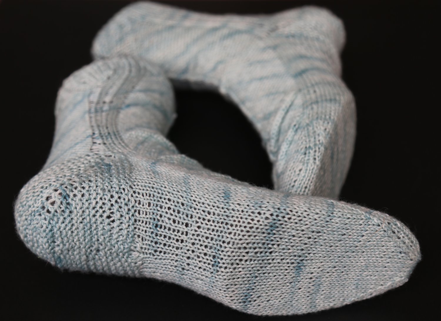 - A pair of pale blue socks knit on the bias. The ribbed cuff slopes upwards, and a line of ribbing goes down the side of the leg and foot.