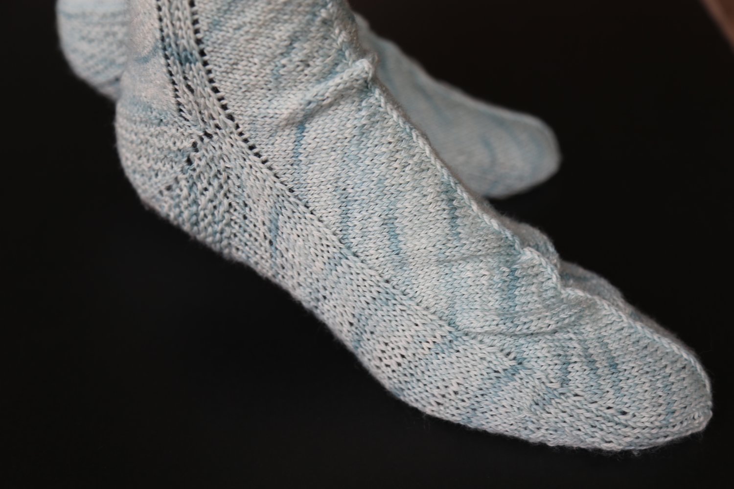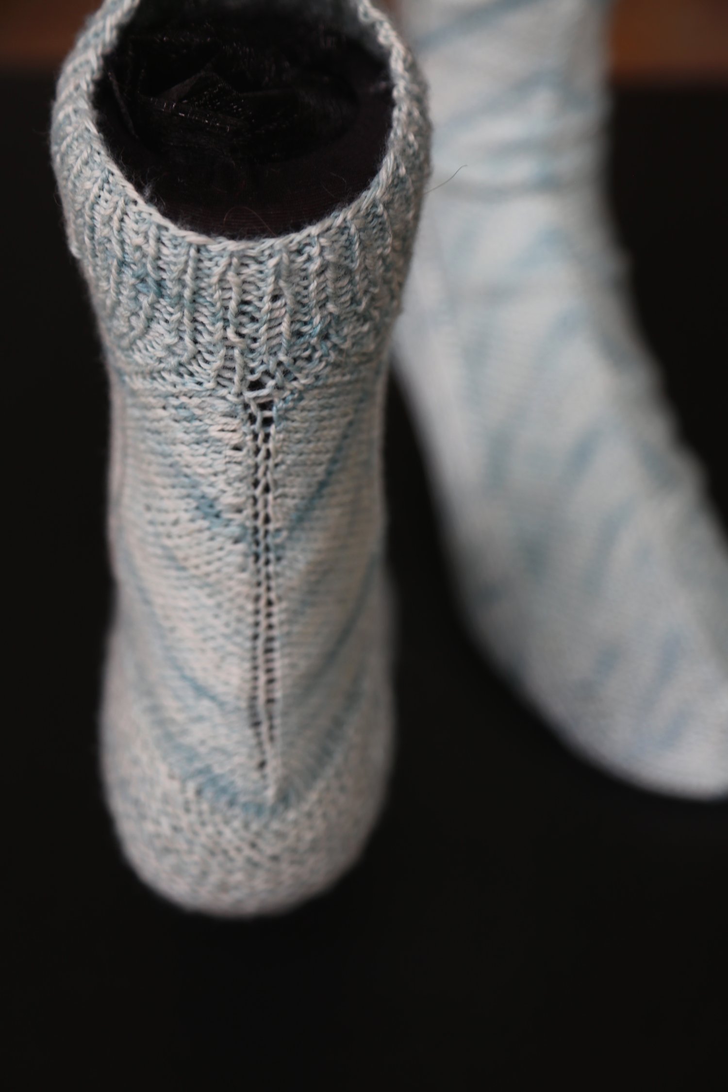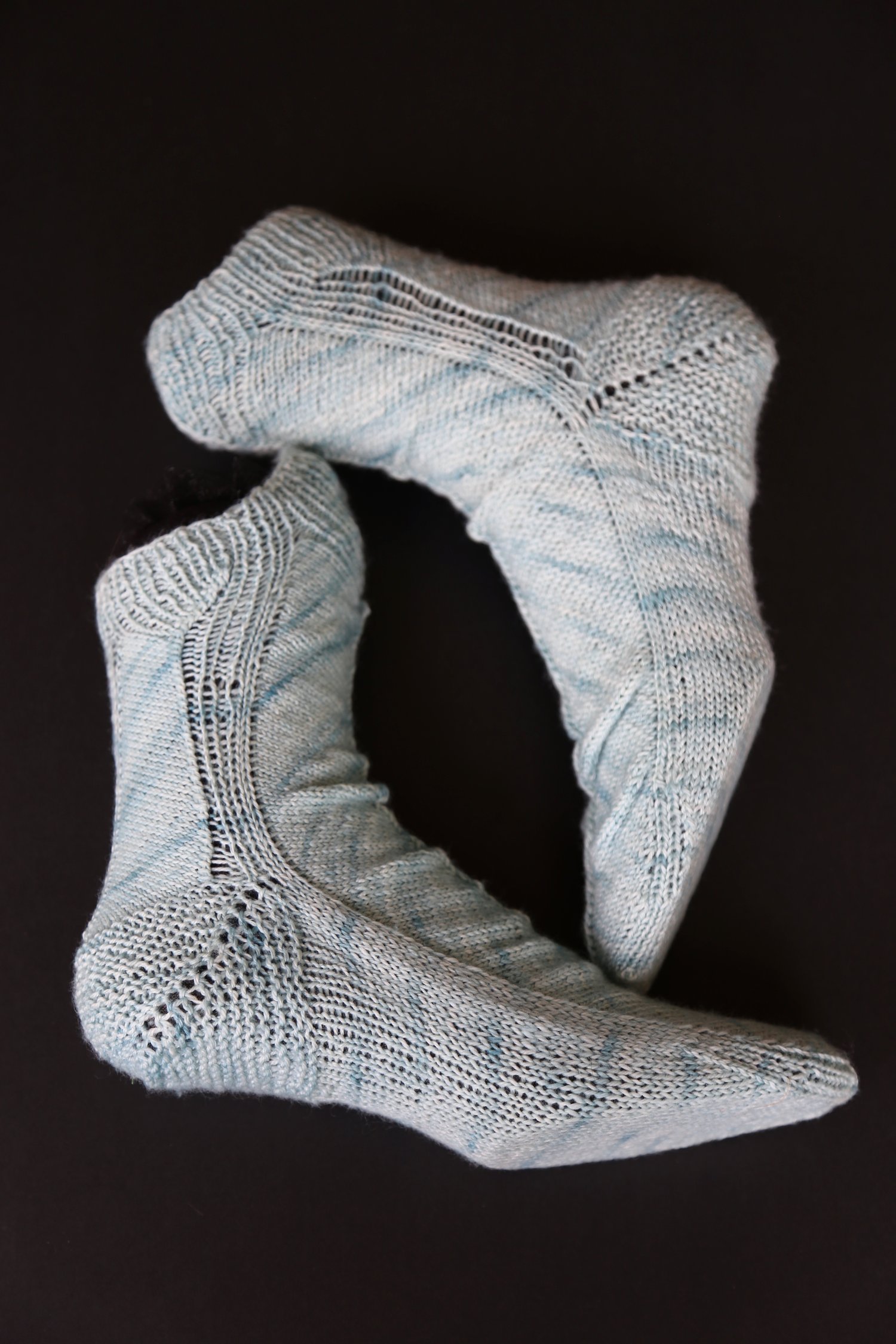 - a pair of pale blue socks knit in fingering-weight yarn. The socks have a line of increases running down the center back of the leg - the socks are knit on an angled bias.