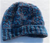 This hat starts with a brim of two-colour Fisherman's Rib, then an increase round begins the mosaic colourwork section. The crown of the hat is decreased in pattern with the mosaic colourwork.