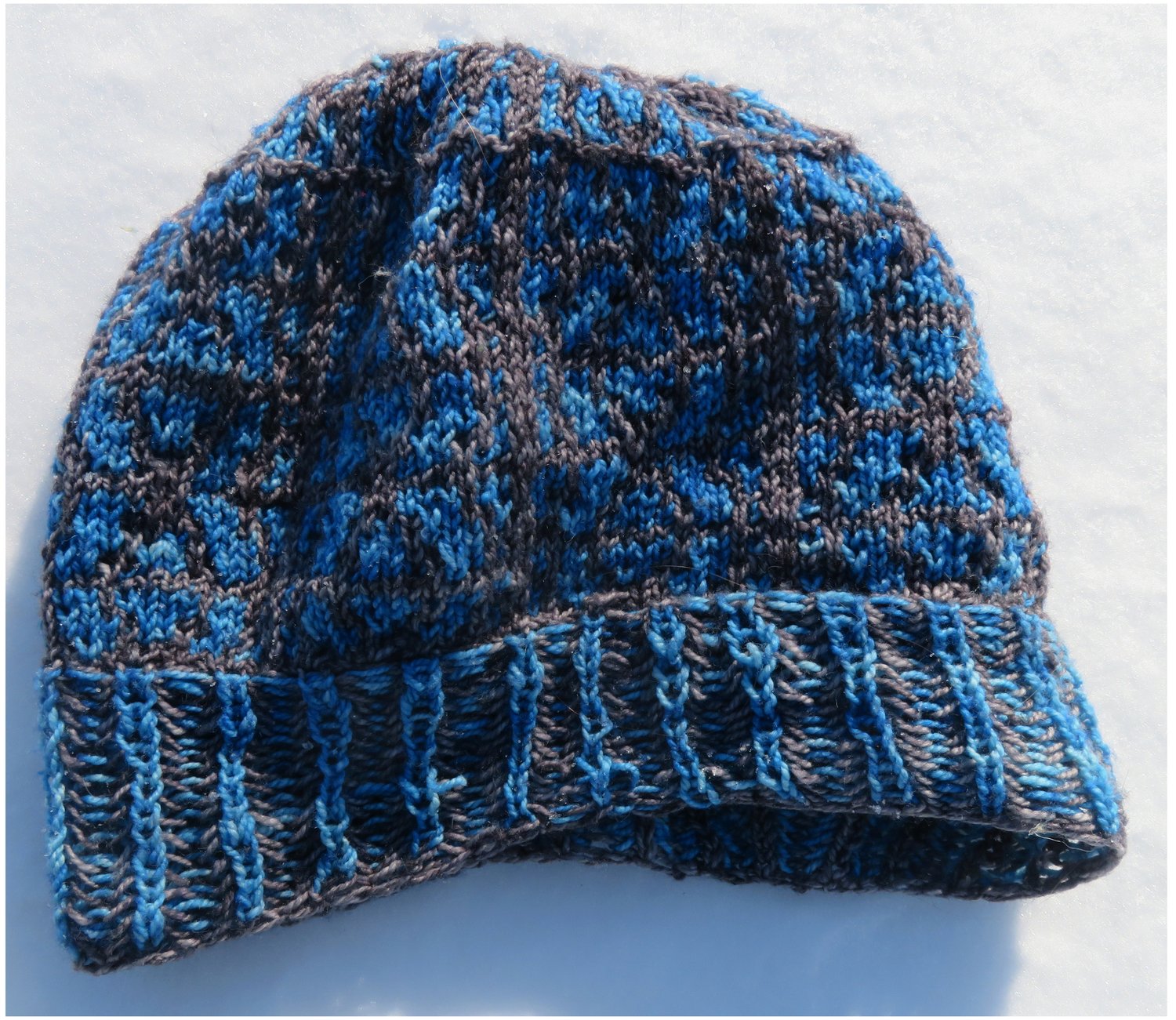 1 and 2) a person laying in a snowbank, wearing a blue and grey colourwork slouchy hat with two-colour ribbing
