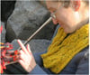 1) A woman wearing a yellow lace cowl flecked with black, knit in a fingering-weight yarn.