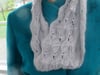 4) someone wearing a grey knit lace cowl in a scalloped lace pattern.