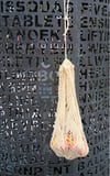 3) A lace and mesh bag hanging down in front of a sculpture wall. The bag is handing from a twisted cord drawstring, and has apples within the mesh.