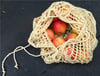 2) A cream-coloured mesh bag with a drawstring. The drawstring is pulled closed and has been tied into a bow.
