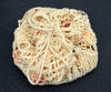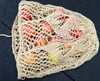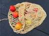 4) An open mesh bag laying on its side. The base of the bag is lace knit in a leaf pattern, which transitions to an open mesh.