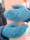 The mittens are mirrored, with a different left-hand and right-hand mitten. Each mitten has a cable pattern on the back of the hand and a slipped-stitch textured palm. The extra yarn on the palm helps keep the hand warm and provides an additional layer against friction and wear (as well as providing help in making snowballs!)