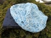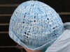 3) A lace hat laying flat. The lace and cable pattern (eyelets, loop stitches and two-stitch cables) runs vertically along the hat and meets at the crown of the hat. Hat is knit in pale blue fingering-weight yarn.